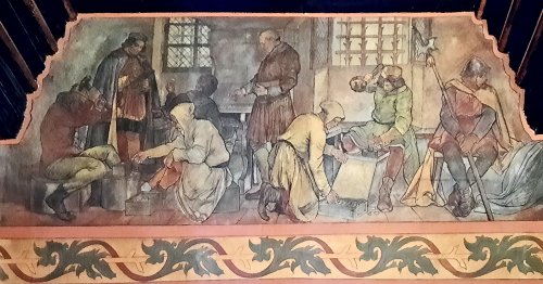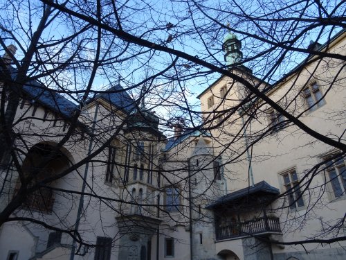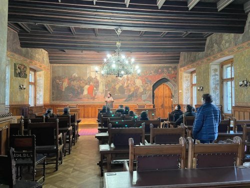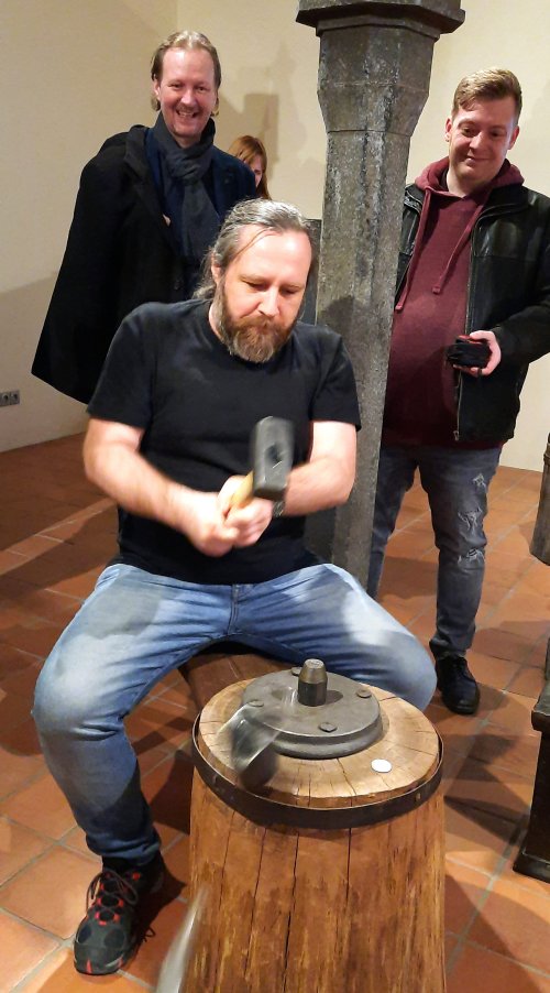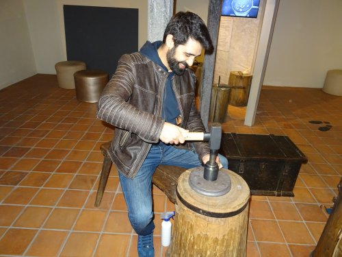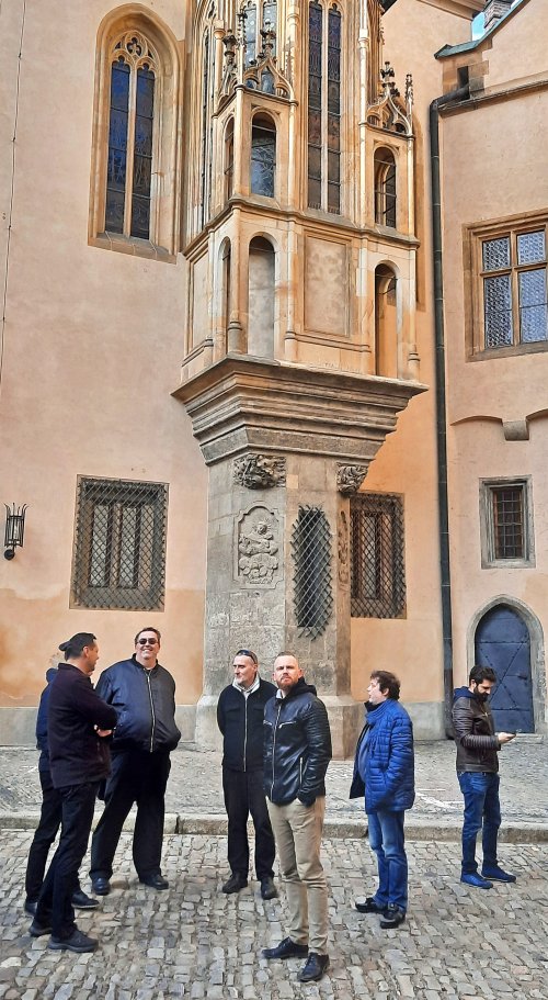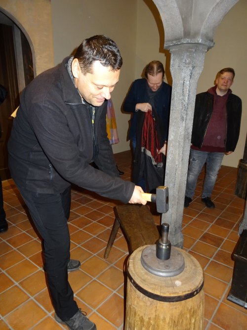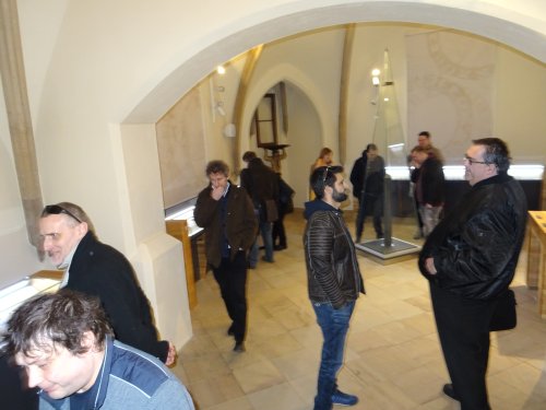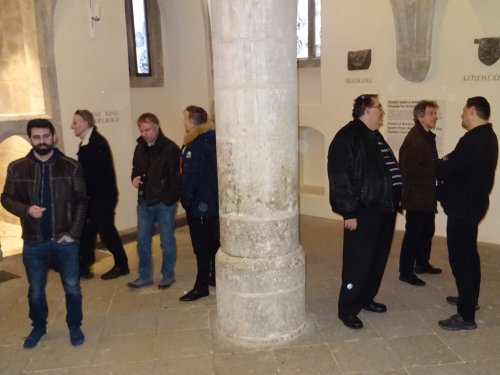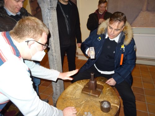 Při naší návštěvě jsme si prohlédli dvě ze zmíněných expozic. Tou první byla celkem logicky „Královská mincovna" a druhou "Královský palác". V mincovně nás pochopitelně zaujaly tři speciální stolové vitríny prezentující mince (převážně precizně provedené kopie, ale i originály!) ražené v kutnohorské mincovně po dobu její činnosti, tedy od roku 1300 do roku 1727. Na čestném místě a ve speciální vitríně je zde vystaven také originální pražský groš Václava II. Bohužel v době naší návštěvy byl mimo provoz „mincovní volant“, speciální zařízení ukazující vývoj mincovnictví na českém území od Keltů po současnost prostřednictvím velkoplošných vyobrazení téměř 600 mincí. Viděli jsme i celou řadu dalších exponátů včetně interaktivních, popisujících celý proces výroby v mincovně. Většina z nás nevynechala možnost vyzkoušet si práci pregéře a vyrazit si hliníkový odražek pražského groše Václava II. Neméně zajímavá byla i prohlídka audienční síně a královské kaple v rámci druhého návštěvního okruhu. V prostorách audienční síně se odehrála řada významných historických událostí, z nichž dvě - vydání Dekretu kutnohorského a volba Vladislava Jagellonského českým králem - jsou zachyceny na jejích stěnách jako velkoplošné fresky. Za povšimnutí zde stojí také původní stropní trámy z 15. století, polychromovaný dřevěný znak Kutné Hory z doby kolem roku 1491 a konšelská lavice (zachráněná z původní radnice při jejím požáru v roce 1770, samotná lavice je však také z 15. století), která je provedena na způsob truhly a má překlopné opěradlo, díky kterému mohli konšelé, když se starostou nesouhlasili, opěradlo otočit a sednout si k němu zády. Královská kaple, představující jedno z vrcholných děl naší gotiky, byla vysvěcena roku 1389 a je dílem parléřovské huti. Zasvěcena je patronům Čech a Uher (tomu od doby, kdy Vladislav Jagellonský získal uherskou korunu) - sv. Václavovi a sv. Ladislavovi, jejich sochy jsou také součástí hlavního gotického oltáře, jenž byl spolu s dalšími dvěma postranními oltáři vyroben již v 15. století. Výmalba kaple je však mladší - secesní - a je dílem manželů Urbanových z roku 1899. Pozoruhodná je také socha Krista stojící v kapli. Vyřezána byla v roce 1502 a původně byla rovněž umístěna v budově radnice, z níž byla zachráněna při jejím požáru. Předlohou pro postavu Krista byl prý některý z místních havířů, pro což má svědčit Kristova svalnatá postava. Další zajímavostí je, že socha fungovala také jako trezor, v trupu Krista je totiž zezadu přístupná dutina, do níž byly ukládány listiny a peníze. Po celou dobu exkurze také probíhala reciproční výměna informací mezi námi a ochotnými průvodci, kteří nás doprovodili.